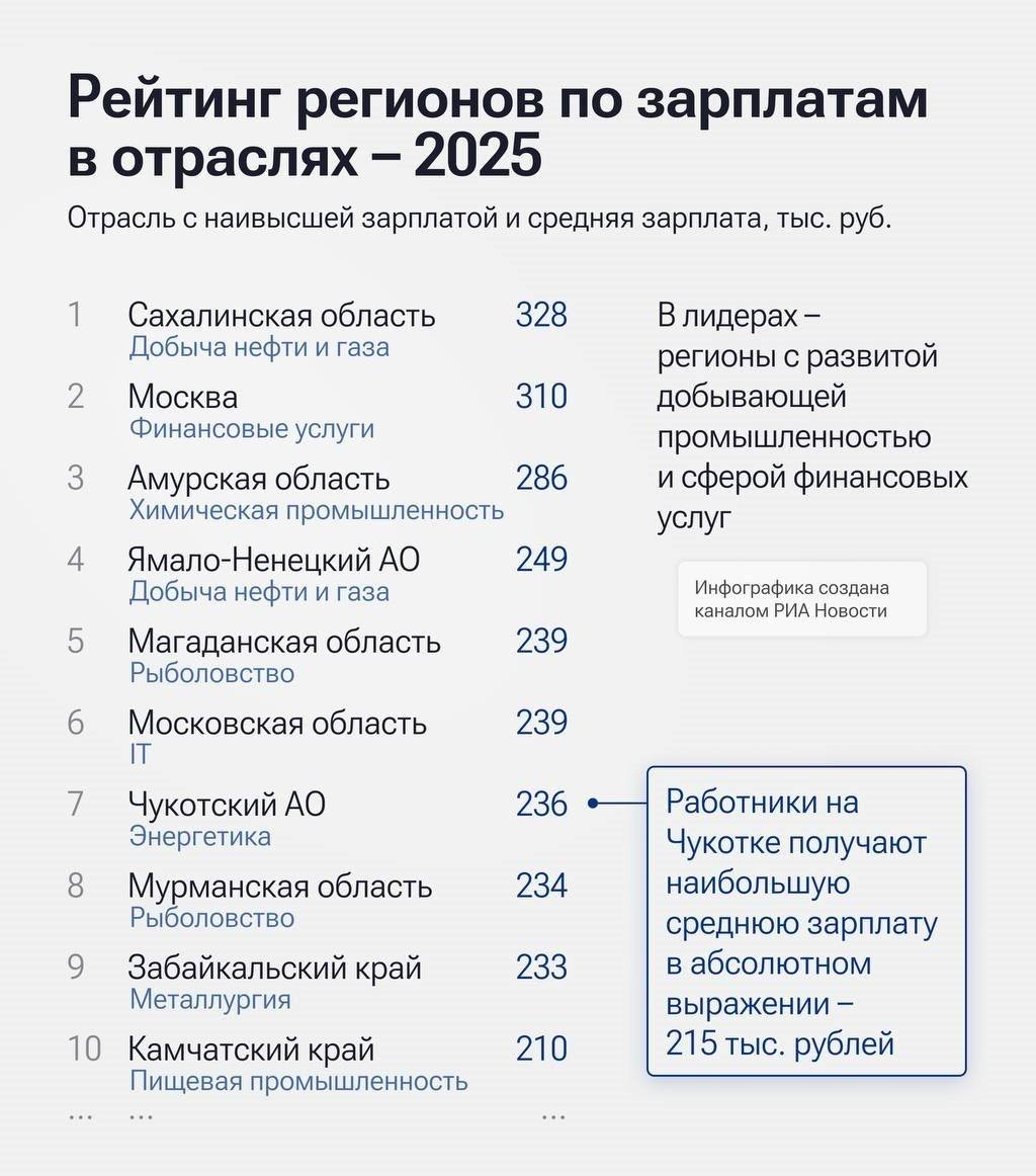 Замыкает тройку лидеров Амурская область. Драйвером роста здесь выступила «Химическая промышленность», где средний доход достиг 286 тысяч рублей. В первую десятку наиболее благополучных субъектов также вошли Ямало-Ненецкий АО, Магаданская и Московская области, Чукотка, Мурманск, а также Забайкальский и Камчатский края. География богатства по-прежнему тесно коррелирует с добычей природных ресурсов и сложной промышленной логистикой.